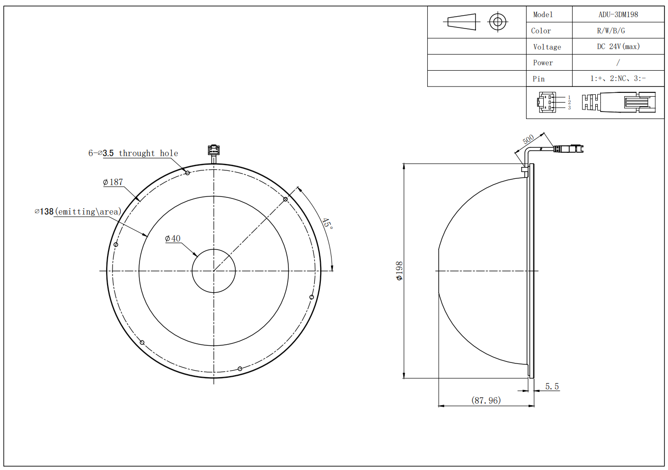 | ADU-3DM198-R/BGW | Red / Blue / Green / White | Ø198 mm / Ø30 mm / H 88.48 mm | 24 VDC | 12.5 W / 21.2 W |